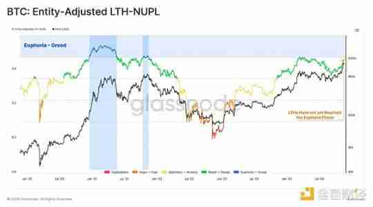 我们可以利用 NUPL 指标来评估 LTH 所持有的账面收益,该指标目前为 0.72,略低于信念 (绿色) 到兴奋 (蓝色) 的阈值 0.75。尽管价格大幅上涨,但与之前的周期顶部相比,这些投资者的情绪仍然较低,这表明可能还有进一步的增长空间。