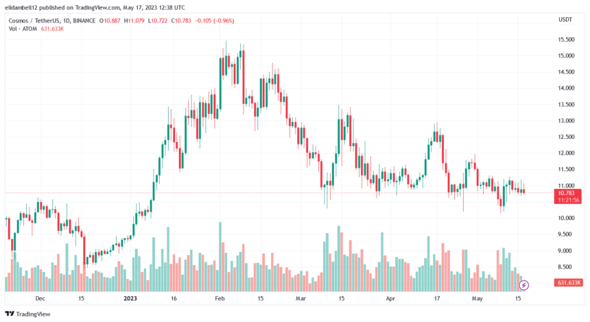 在经历了 2023 年 4 月 17 日的看跌趋势后,该资产从 12.88 美元跌至 10.12 美元的低点,Cosmos (ATOM) 已成功小幅回升。2 月 8 日至 5 月 17 日,ATOM 大幅下跌 32.89%,在 5 月 9 日触及 10.175 美元的低点。然而,当月对Cosmos(ATOM)的需求激增,导致价格表现出色。
