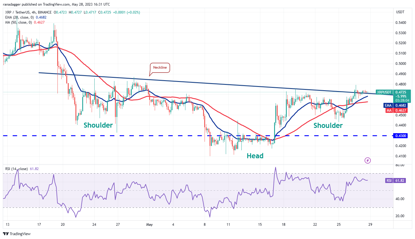 20 日均线(0.45 美元)逐渐向上倾斜,RSI 已跃升至正值区域,表明阻力最小的路径是上行。如果多头推动并将价格维持在颈线上方,则 XRP/USDT 货币对可能会开始反弹至 0.54 美元至 0.58 美元之间的上方阻力区。看涨设置的形态目标是 0.55 美元。