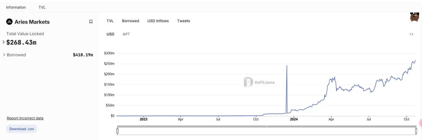 作为当前 Aptos 上规模最大的 DeFi 借贷项目,Aries Markets 同样是首个上线 Aptos 借贷生态的 OG 项目。如今仅是 Aries Markets 一个项目的 TVL 就达到 2.6 亿美元,体量相当于 Aptos 生态总 TVL 的四分之一还多。当前协议已有超 4 亿美元的借款额。强势的 TVL 增长与高体量的借贷量体现 Aries Markets 在 Aptos 生态的重要性。