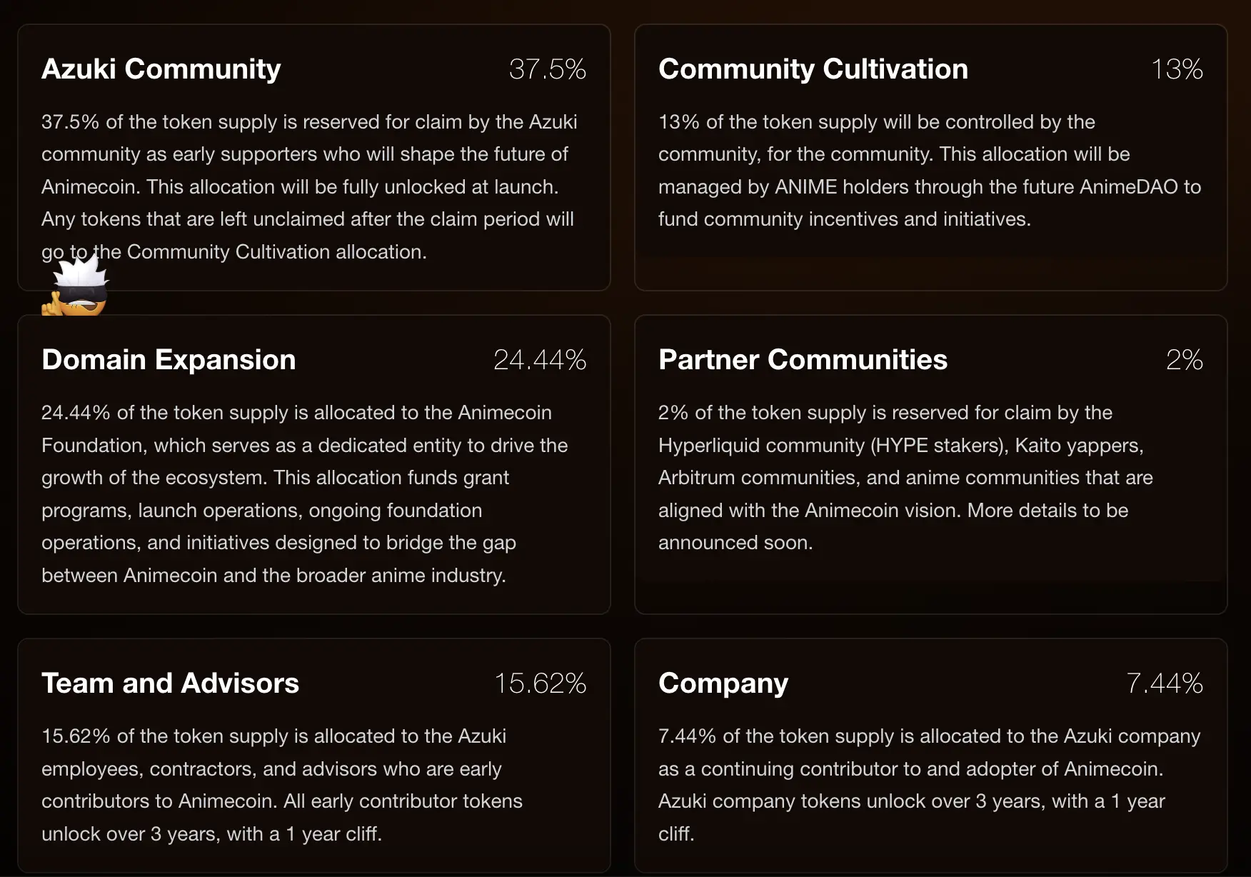 ANIME代币总供应量为100亿枚,初始流通量为76.9亿枚(76.9%)。代币分配如下:Azuki社区37.5%、AnimeDAO 13%、Animecoin基金会24.44%、合作社区2%、团队和顾问15.62%(一年锁定期后解锁33.33%,其余线性解锁)、Azuki公司7.44%(一年锁定期后解锁33.33%,其余线性解锁)。Hyperliquid社区、Kaito yappers和Arbitrum社区将获得空投。