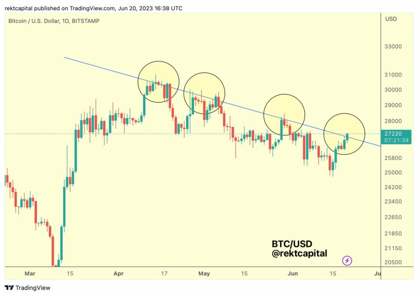 Rekt Capital 指出,在蓝色较低高对角线阻力的背景下,很难寻找比特币的每日突破确认,如下图所示,因为比特币在每日时间范围内多次突破后重新测试都失败了。