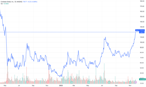 根据 TradingView 的数据,11 月 27 日,Coinbase 收于 119.77 美元,为 2022 年 5 月 5 日以来的最高水平,当时收于 114.25 美元。盘后交易几乎没有变化。