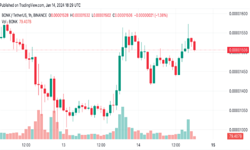 相比之下,柴犬 (SHIB) 周日小幅下跌 0.1%,尽管上周已上涨 6.4%。Bonk (BONK) 在 meme 币领域排名第三,在周日交易期间兑美元飙升 9%。此外,BONK上周上涨了44.2%。