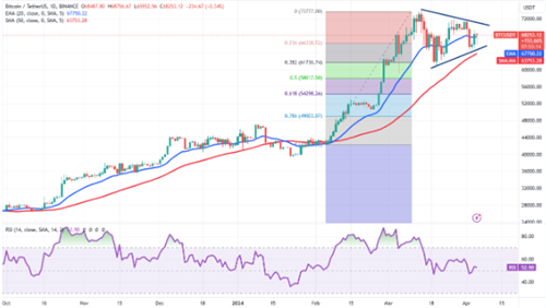 市场分析人士指出,如果比特币价格下跌并跌破这个对称三角形的下边界,这可能预示着市场将开始一轮更深的回调。在此情况下,BTC/USD汇率可能会下滑至60000美元水平,甚至可能进一步下探至斐波那契回撤位的61.8%,即54298美元附近。