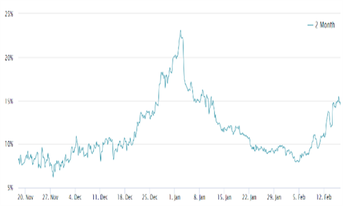 2月9日,delta skew指标进入牛市市场的-7%阈值,目前处于三个月来的最低水平。这些发现与以太坊期货数据相符,并描绘出一幅适度乐观的画面,这并不过度,但多头和空头之间也不平衡。