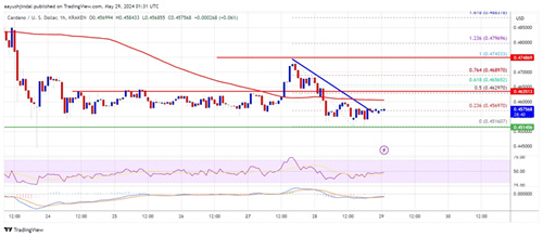 如果卡尔达诺的价格未能攀升至0.4620美元的阻力位上方,它可能会继续下跌。下行路上的即时支撑位在0.4520美元附近。
