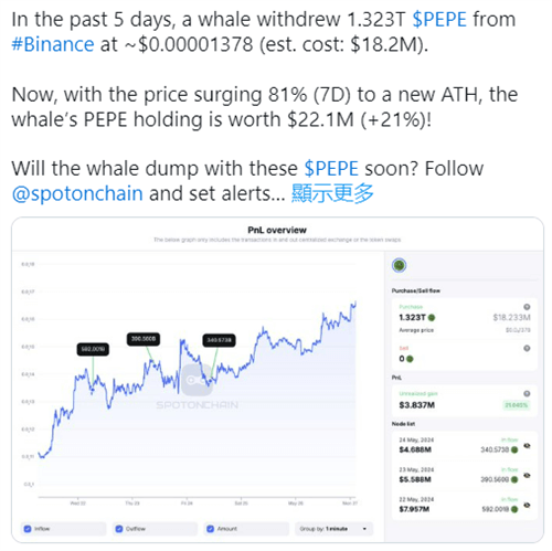 此外,从基本面来看,PEPE的出色表现也与其不断增长的用户基础和活跃的社区氛围密不可分。链上分析公司Santiment的数据显示,在短短十天内,持有PEPE的活跃地址数从3600个激增到12000个,这表明越来越多的投资者开始关注和持有PEPE。同时,大型投资者的入场也进一步推动了PEPE价格的上涨。据链上追踪平台Spot On Chain报告,一头“鲸鱼”在过去五天内从币安撤回了大量PEPE代币,其投资组合已经产生了可观的回报。