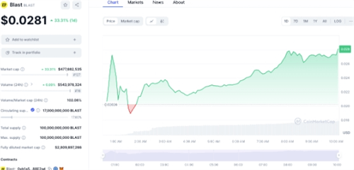 根据CoinMarketCap的数据,自那时以来,BLAST的价格已经上涨了40%以上,至发布时的0.0281美元。