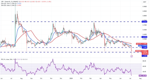 瑞波币XRP价格经历了显著的波动。在7月4日,XRP价格跌破0.46美元的关键支撑位后,市场情绪明显转弱,价格进一步下探至0.41美元以下,显示出空头力量的增强。然而,从日线图上的蜡烛形态来看,长下影线表明在价格触及低点时,有买方力量介入,试图阻止价格的进一步下跌,并努力将价格维持在0.41美元上方。